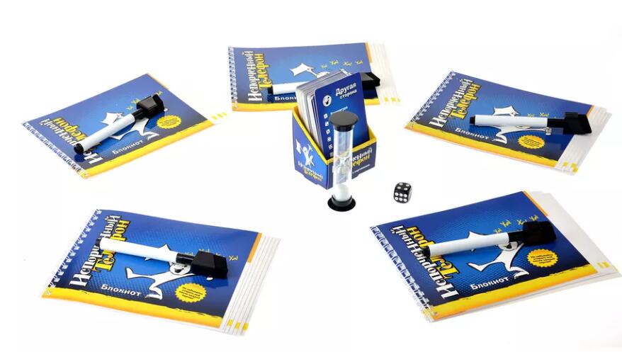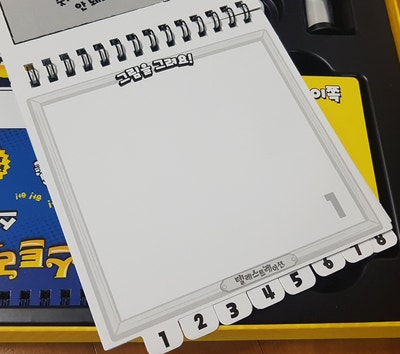 상자에는 양면 단어 카드, 스케치북, 마커, 클리너, 주사위 그리고 모래시계가 포함되는데요.