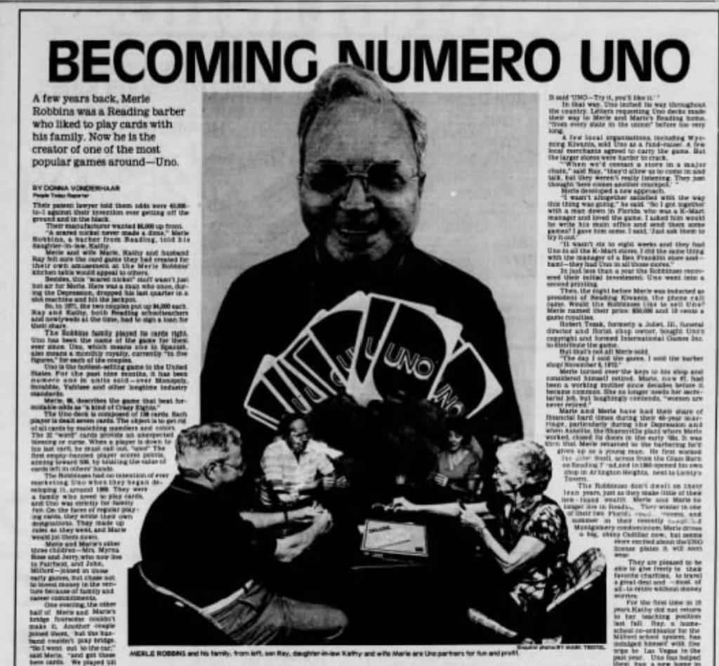 우노는 1971년 미국에서 개발되었습니다. 이발사였던 멀 로빈스(Merle Robbins)는 우리나라에서는 원카드로 불리는 게임인 크레이지 에이츠(Crazy Eights)를 매우 좋아했는데요. 시간이 날때마다 가족이나 지인들과 크레이지 에이트를 즐겨했다고 합니다. 워낙 이 게임을 좋아했기 때문에 조금씩 기존 규칙을 변형하거나 자신만의 규칙을 추가하기 시작했는데요.